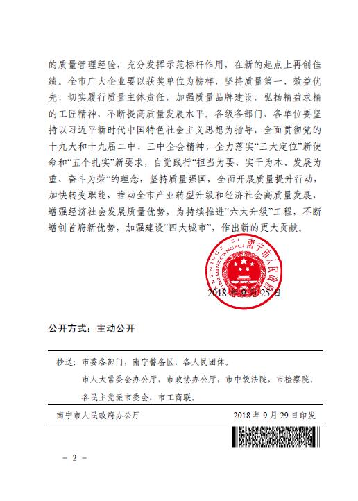 據悉,南寧市市長(cháng)質(zhì)量獎是由南寧市人民政府設立的最高質(zhì)量榮譽(yù),專(zhuān)門(mén)授予南寧市實(shí)施卓越績(jì)效質(zhì)量管理模式,質(zhì)量水平和自主創(chuàng )新能力在廣西同行業(yè)處于領(lǐng)先地位,并取得顯著(zhù)經(jīng)濟效益和社會(huì )效益的企業(yè)或組織。